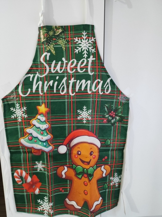 Fartuch „Sweet Christmas” — uroczy towarzysz zimowych wypieków. Otulony klasyczną kratą w odcieniach głębokiej zieleni i ciepłej czerwieni, fartuch „Sweet Christmas” emanuje nostalgicznym urokiem świąt. Delikatne, białe śnieżynki rozsiane po materiale przywołują wspomnienie pierwszego śniegu, a bajkowe ilustracje — piernikowy ludzik w czapce Mikołaja, choinka ozdobiona bombkami, gwiazdkowy ciasteczek i kokarda z czerwonej wstążki — dodają mu figlarnej słodyczy.