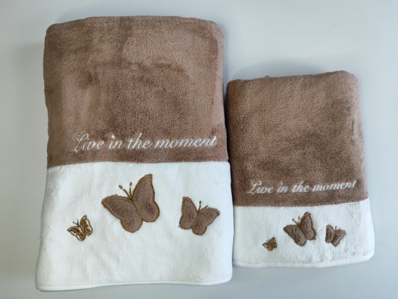 Ręczniki brązowe „Live in the Moment” — codzienna pielęgnacja z nutą poezji Miękkie jak poranna mgła, ręczniki z kolekcji „Live in the Moment” to zaproszenie do chwili dla siebie — tej cichej, intymnej, w której ciało spotyka się z troską, a zmysły z estetyką. Ich dwukolorowa kompozycja — subtelna biel połączona z pastelowym lub ziemistym odcieniem — tworzy harmonijną całość, a haftowane motyle i inspirujący napis przypominają, by zatrzymać się na moment i oddychać głęboko.