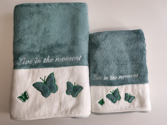 Ręczniki zielone „Live in the Moment” — codzienna pielęgnacja z nutą poezji Miękkie jak poranna mgła, ręczniki z kolekcji „Live in the Moment” to zaproszenie do chwili dla siebie — tej cichej, intymnej, w której ciało spotyka się z troską, a zmysły z estetyką. Ich dwukolorowa kompozycja — subtelna biel połączona z pastelowym lub ziemistym odcieniem — tworzy harmonijną całość, a haftowane motyle i inspirujący napis przypominają, by zatrzymać się na moment i oddychać głęboko.
