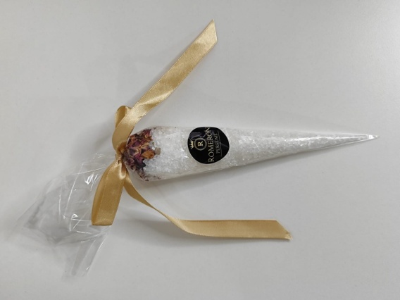 Romeron Perfume Bath Salt — rytuał zanurzenia w zapachu. Zamknięta w przezroczystym stożku niczym kryształowy eliksir, sól do kąpieli Romeron Perfume to celebracja zmysłów i chwili dla siebie. Jej śnieżnobiała struktura, ozdobiona płatkami suszonych kwiatów i przewiązana satynową wstążką, przypomina zaproszenie do prywatnego spa — pełnego aromatów, ciszy i regeneracji.